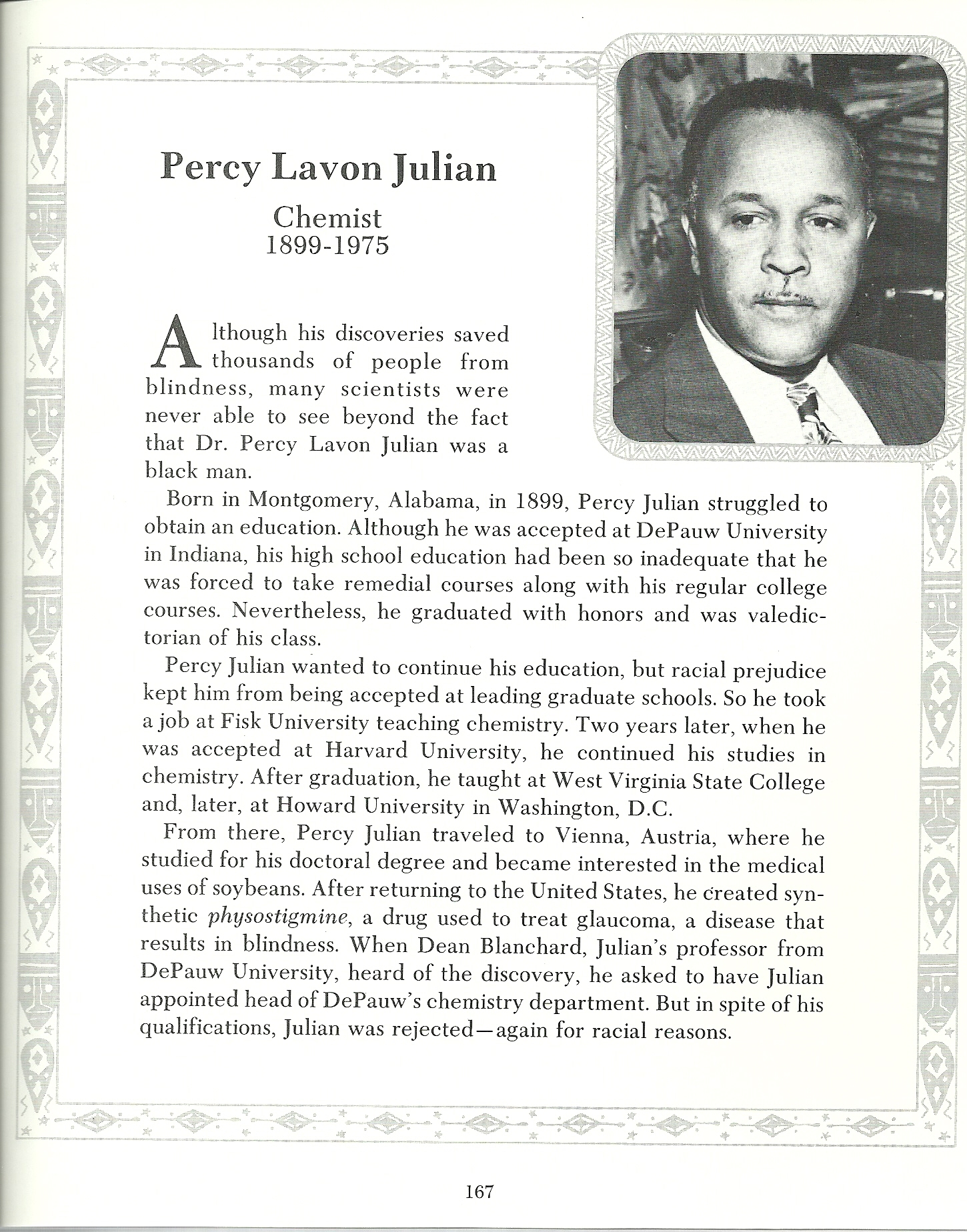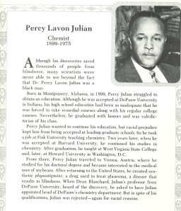 Forgotten Genius is the title of a NOVA Documentary about one of the great black scientist of the 20th century; Percy Lavon Julian*(1899-1975). It is aptly titled for a man who created drugs to treat glaucoma as well as arthritis just to name a few. Did you know that during his lifetime he owned more than 100 chemical patents? He also became the first black chemist to direct a chemical research laboratory when he was hired by Glidden in 1936, unheard of for a black man during that time. He was awarded 18 honorary degrees and membership to the prestigious National Academy of Sciences—only the second African-American bestowed such an honor. Percy’s life was not without struggles especially in obtaining an education. When there was no high school for him to attend in his native Alabama he did two years at a teacher training school for African-Americans but when he was admitted to DePauw University in Indiana that education was considered inadequate and Julian had to take remedial courses along with his regular college courses. No matter because in four years he graduated valedictorian of his class. Julian’s brilliance met roadblock after roadblock mostly because of the color of his skin but he prevailed against the odds and mentored dozens of young black chemists.