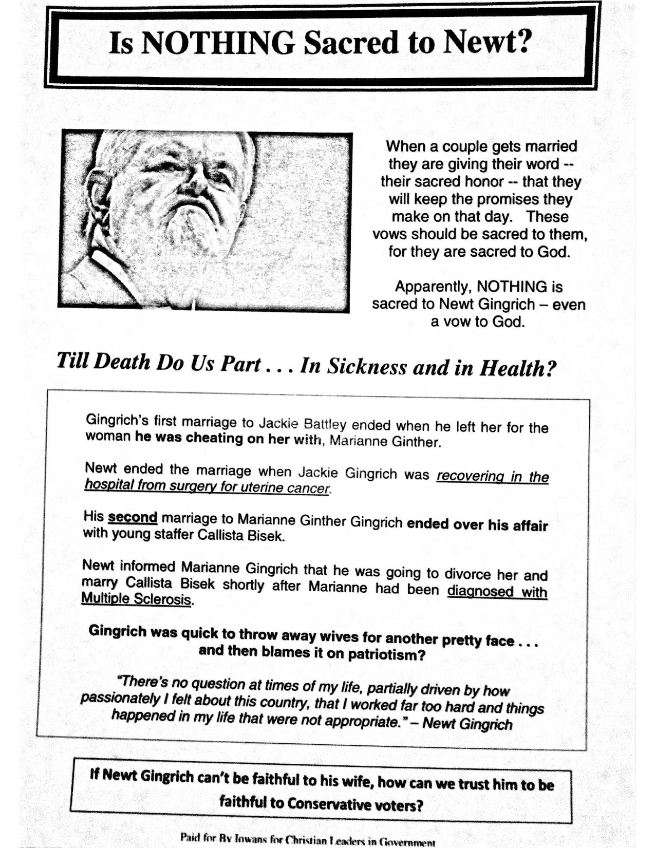Let me get back to Newt and the values conundrum he faces, in particular his hypocrisy. Everyone knows about both the two ex-wives and that he left both of them during serious illnesses but who can forget how he railed against Bill Clinton’s values during the Lewinsky scandal all the while he was having an affair with soon-to-be third wife Callista Bisek. They were regularly seen having breakfast together in the Supreme Court Cafeteria throughout the 90s though the affair didn’t come out publicly until much later. The affair was apparently common knowledge on the Hill so much so that many felt sorry for second wife Marianne. She would later reveal in an interview that he asked her to tolerate the affair.