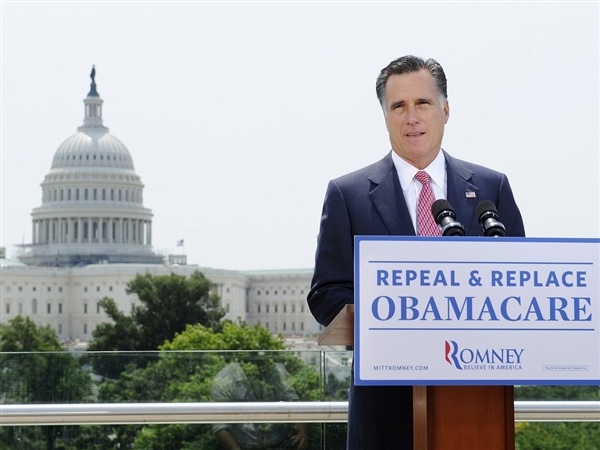 “What the court did not do on its last day in session, I will do on my first day if elected president of the United States. And that is I will act to repeal ‘ObamaCare,’” Romney said Thursday in Washington, adding to his portfolio the politically thorny pledge to undo President Obama’s health reform law.