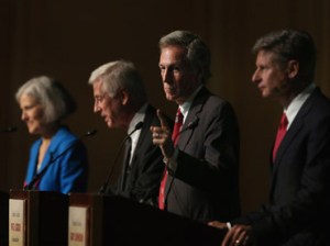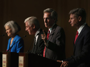 Constitution Party presidential candidate Virgil Goode (2nd R) makes a point as Jill Stein (L) from the Green Party, Rocky Anderson (2nd L) from the Justice Party and Gary Johnson (R) from the Libertarian Party look on during a debate hosted by the Free and Equal Elections Foundation and moderated by former CNN talk-show host Larry King on October 23, 2012 in Chicago, Illinois. (Scott Olson/Getty Images/AFP)
