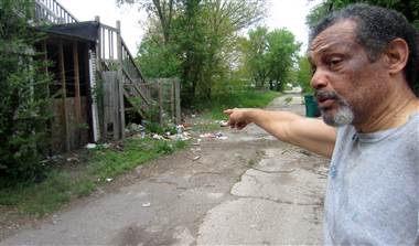 Next door is an empty house where “drugheads” – as Joe calls them – often set up camp. Behind is a duplex with trash visible through every broken window, and an alley clogged with refuse spilling from several abandoned lots.