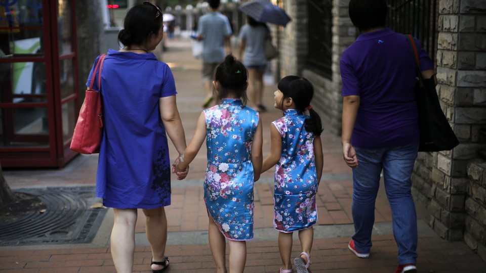 A woman walks with her two daughters at a busy street in downtown Shanghai July 11, 2013.